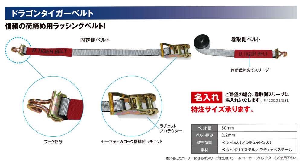 ベルト、金具・ラチェットの全てにおいて耐久性・安全性に優れた信頼の品質で、運送・荷役だけでなく、倉庫・林業・漁業・工場等幅広い業界・用途で活用する事が出来ます。